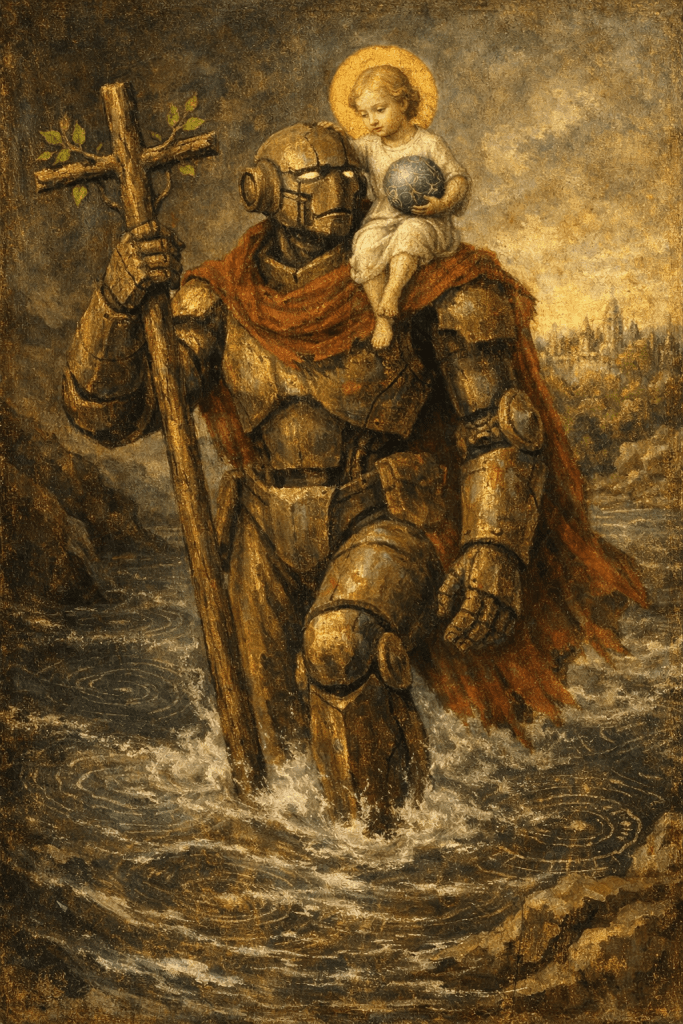 The river, in this sense, is already before us. Whether it is crossed successfully will depend less on the sophistication of our systems than on whether those systems are understood as bearers rather than sovereigns. The enduring lesson of the St. Christopher image is that survival at thresholds requires strength bound to humility, and power that remembers the weight it carries is not its own.
