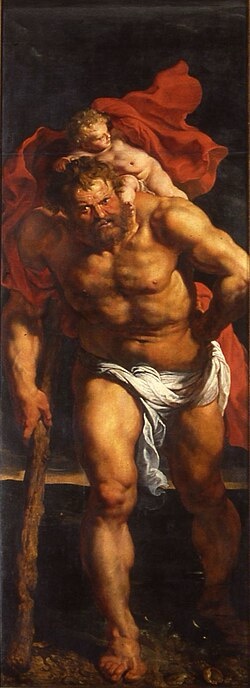 In the medieval accounts, Christopher is a giant who seeks to serve the greatest power in the world. His search is pragmatic rather than spiritual. He transfers his loyalty from earthly rulers to darker forces and finally, indirectly, to Christ. Unable to read or engage in formal devotion, he is instructed to perform a task suited to his physical strength. He carries travelers across a river that regularly claims lives.